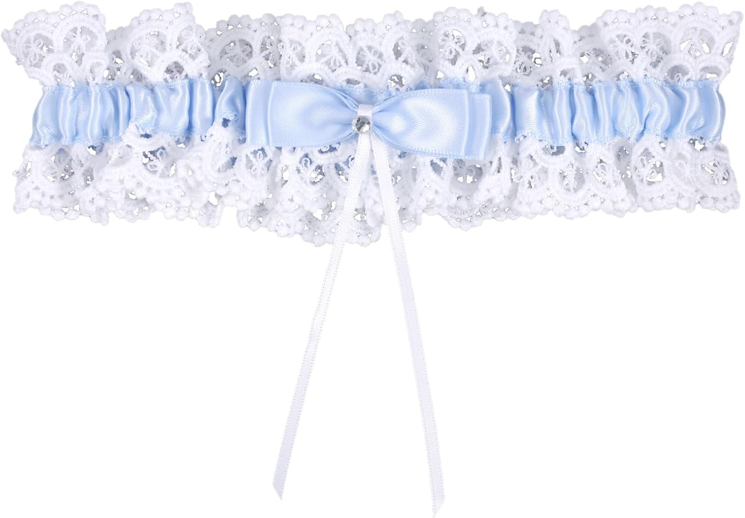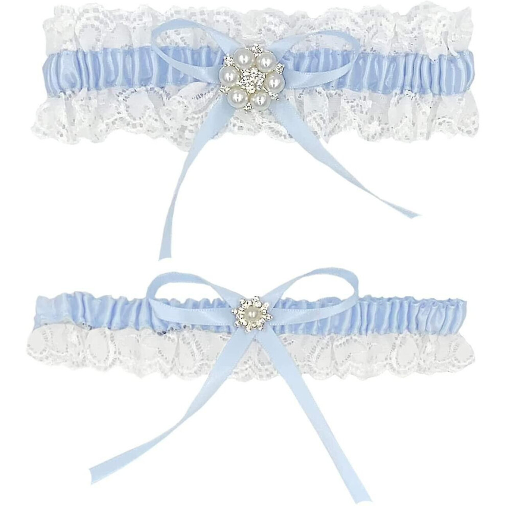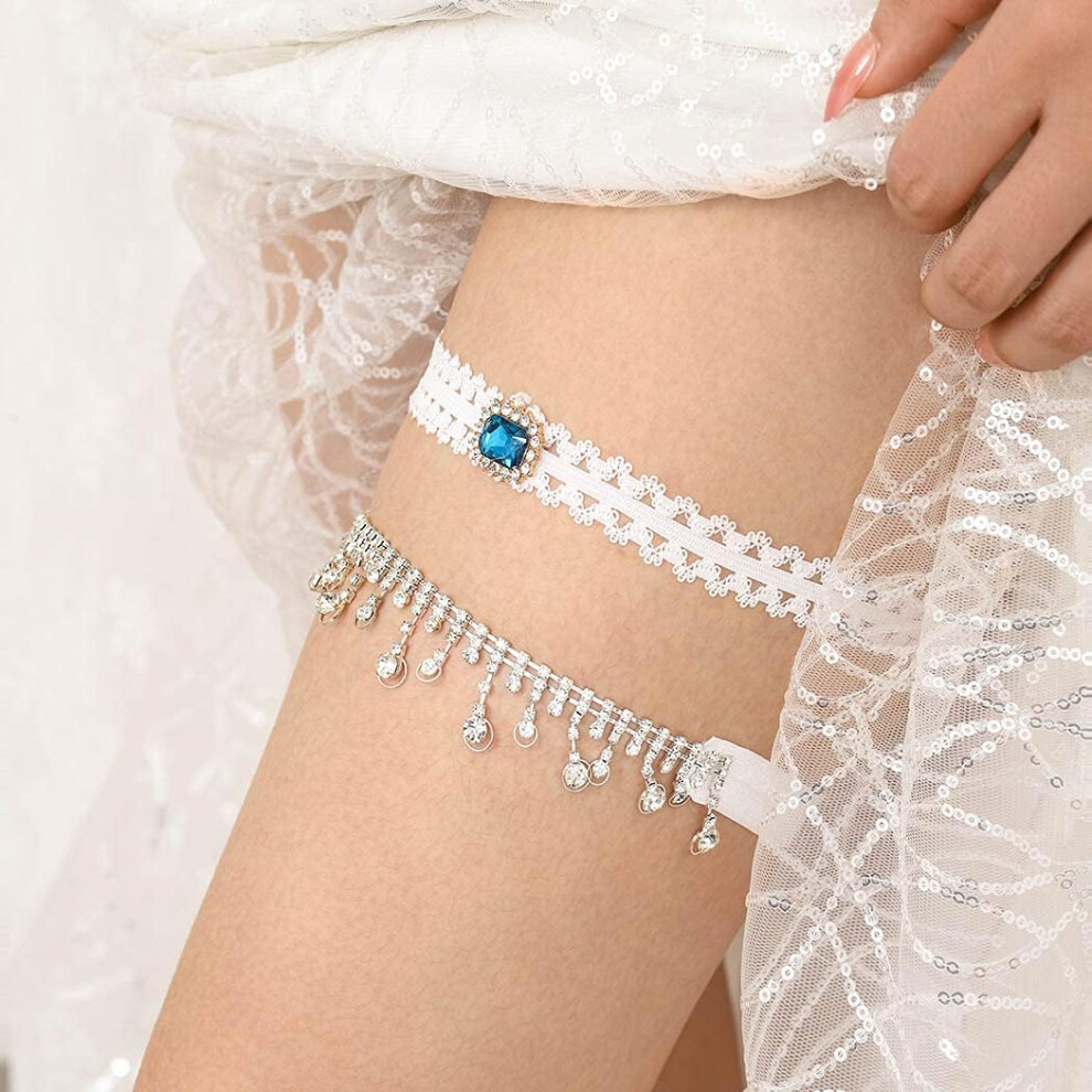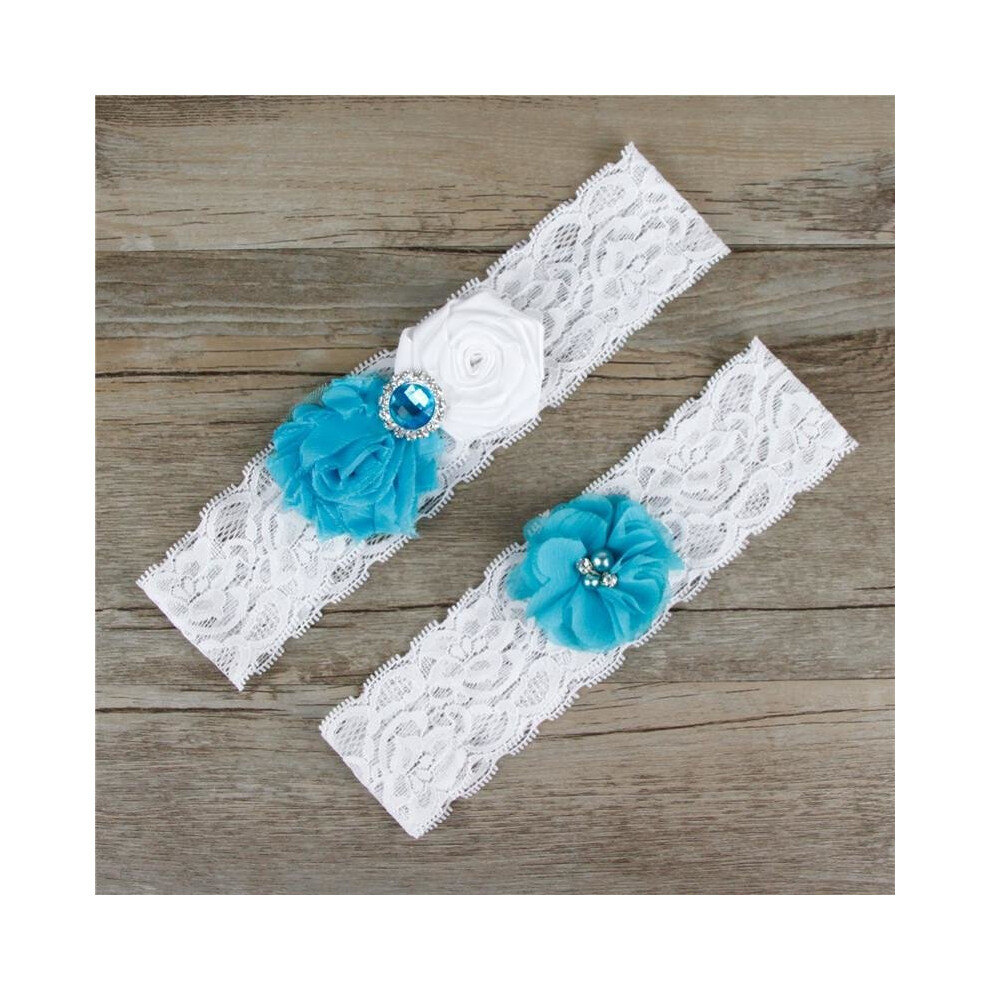 2 Pcs Bridal Wedding Garter for Bride White Lace Rhinestones Blue Garters Floral