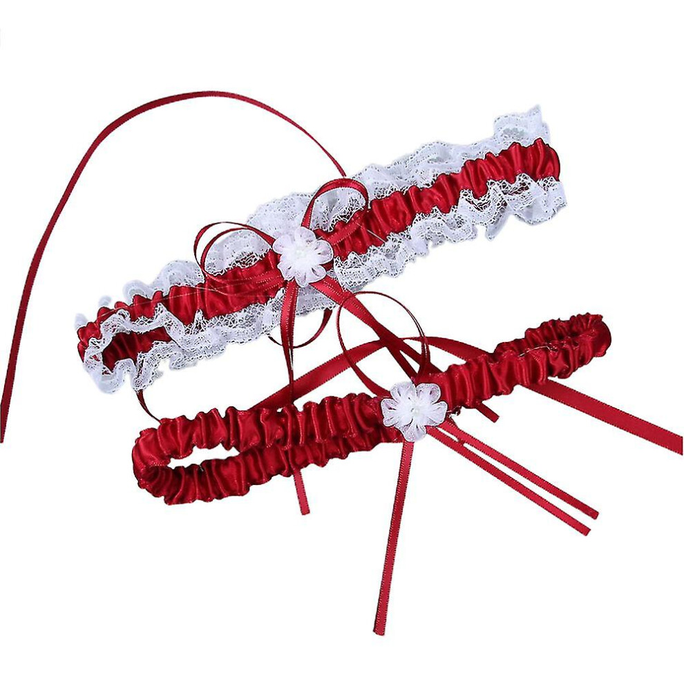 (Wine Red) 2pcs Wedding Garter For Bride Prom Lace Garters Bridal Leg Stretchy Garter Set