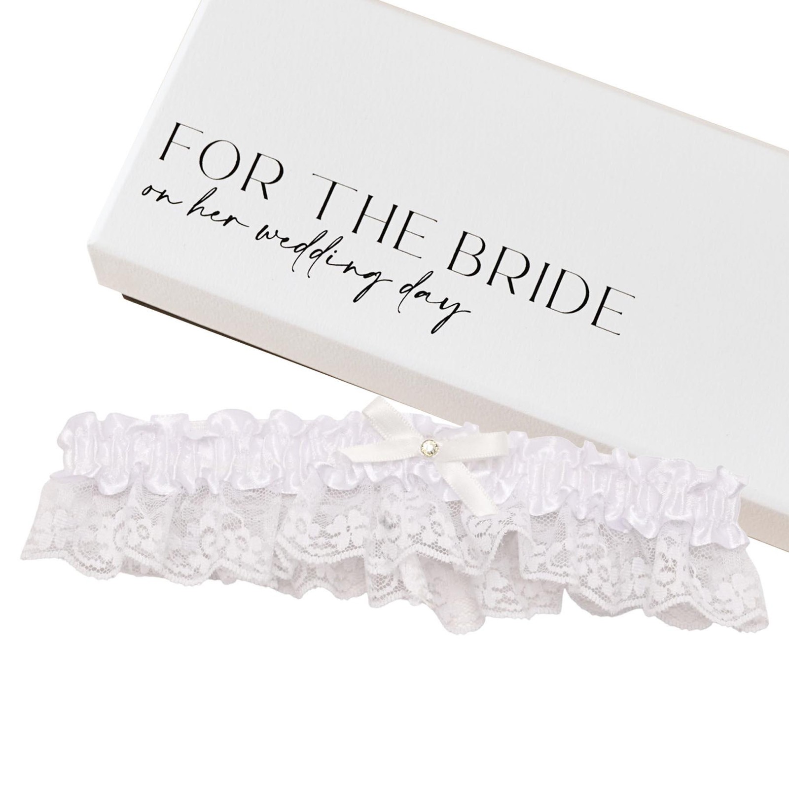 Boxed Wedding Garter for Bride White Satin with Lace and Ribbon Bow by Amore