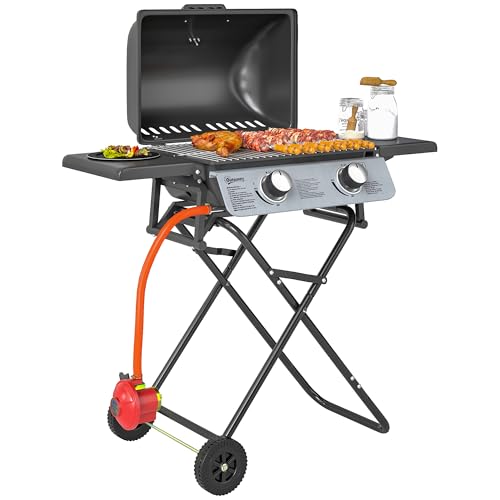 Outsunny 2 Burner Gas Barbecue Grill Garden Portable Tabletop Bbq W/ Folding Legs, Lid, Thermometer, Carbon Steel Body, Black