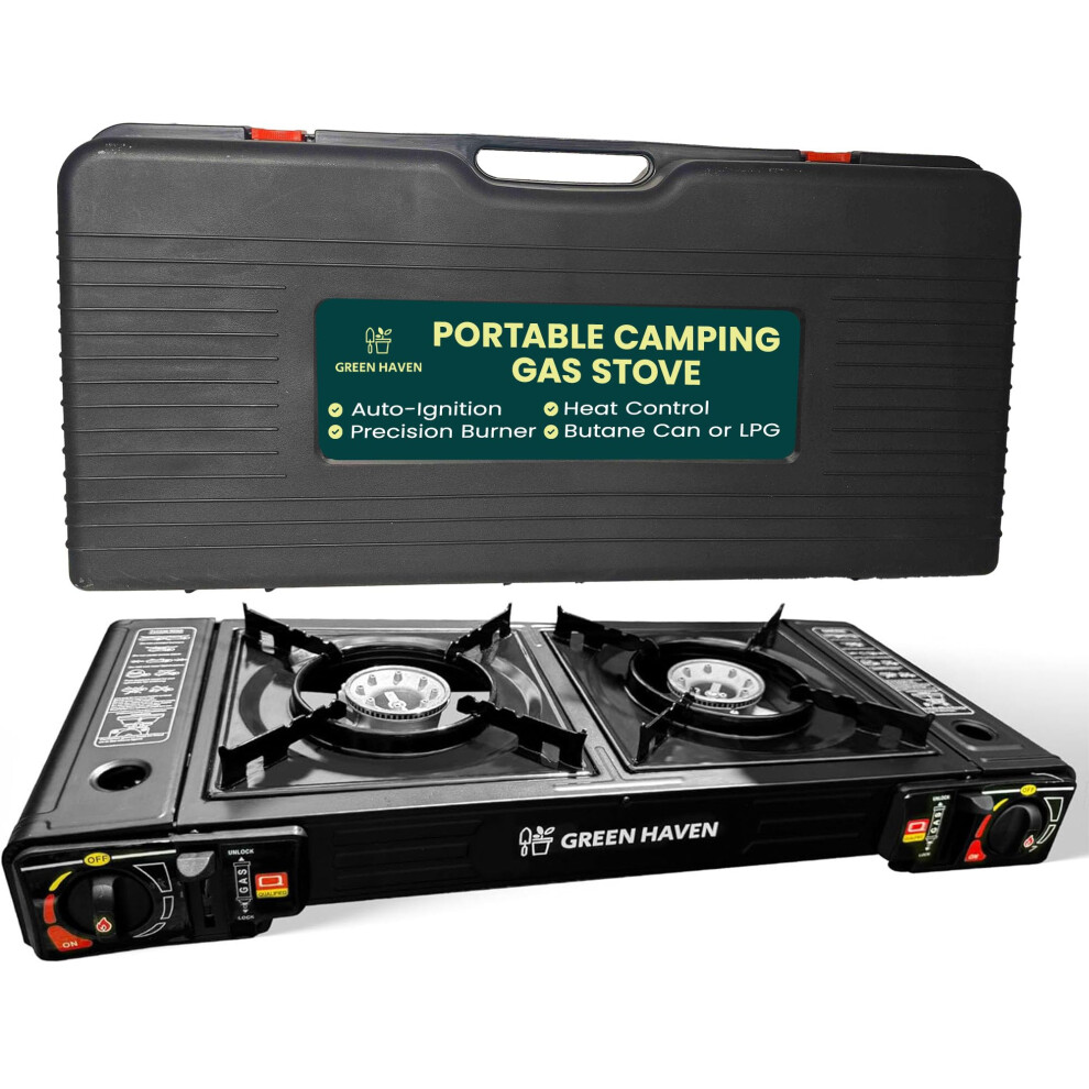 Green Haven Double Burner Camping Stove, Portable Butane Gas or LPG Cooker with Grill Plate and Outdoor Gas Cooker - Camping Cooker for BBQ Caravan