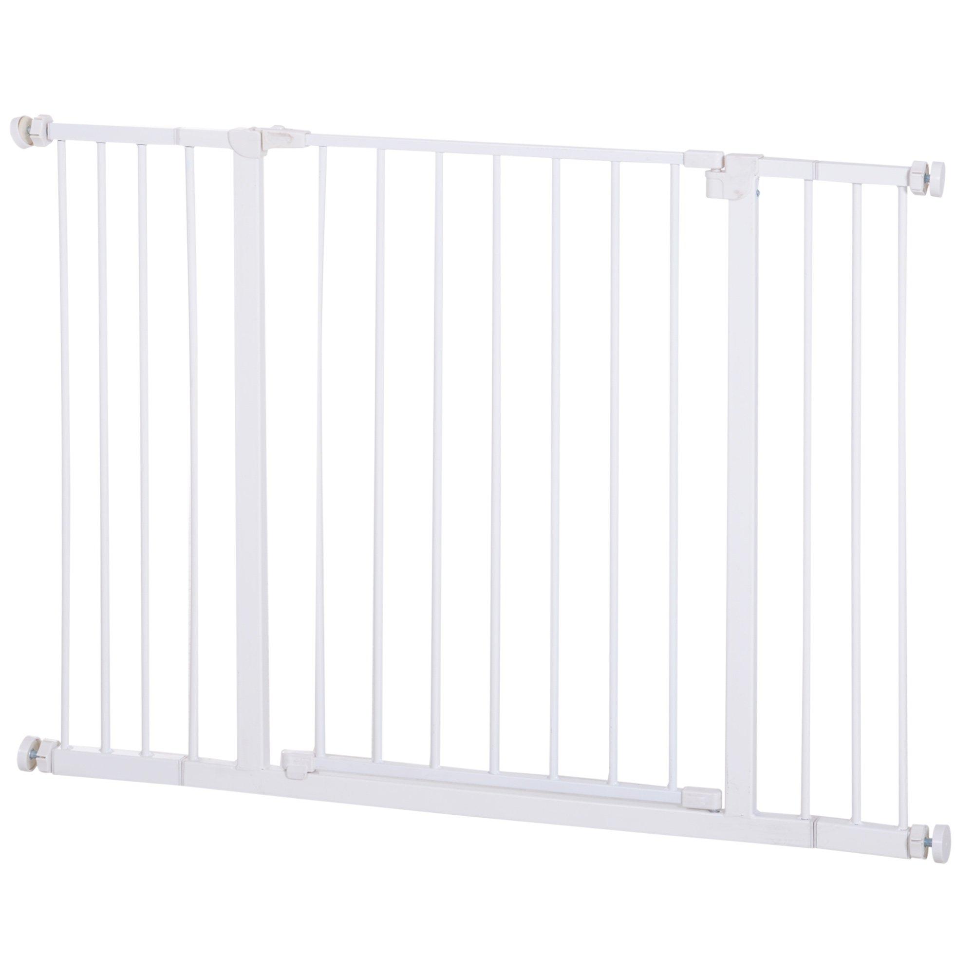 Baby Gate for Doors and Stairs, 10 cm Extension, Stair Gate Pressure Fit - No Screws, Child Stair Gate for Widths 75 to 85 cm, Dog Safety Gate One-Handed Opening to Both Sides, Metal, White/Grey