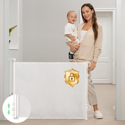 derimkcoa Retractable Stair Gate for Baby,Mesh Baby Gate or Mesh Dog Gate,86cm Tall,Extends up to 140cm Wide,Child Safety Gate for Doorways, Stairs, Hallways, Indoor/Outdoor, White