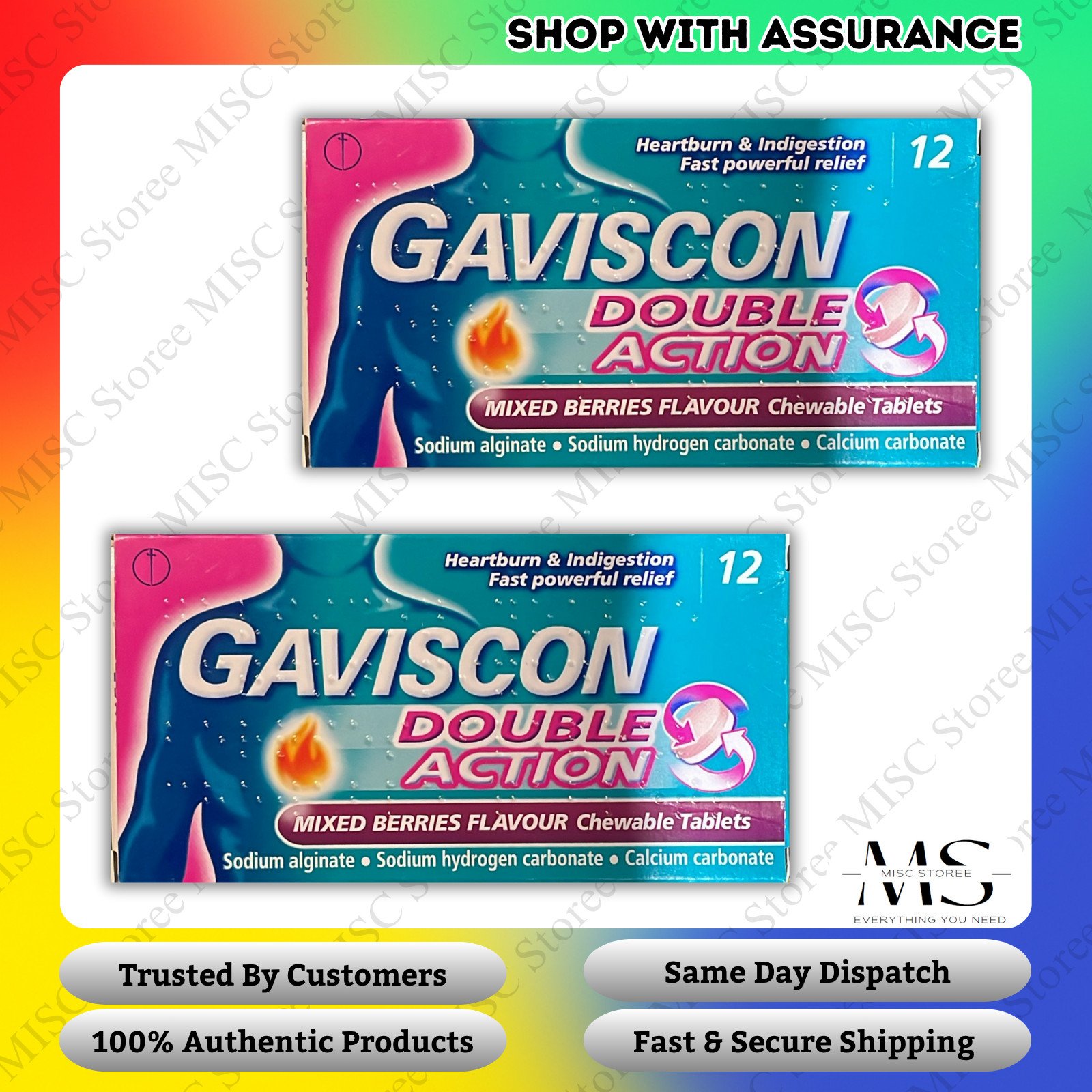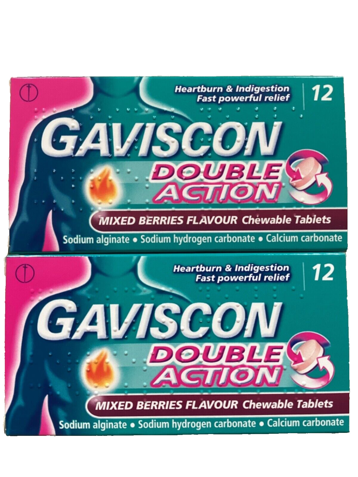 Gaviscon Double Action Mixed Berries -2x12= 24 TABLETS heartburn & indigestion.