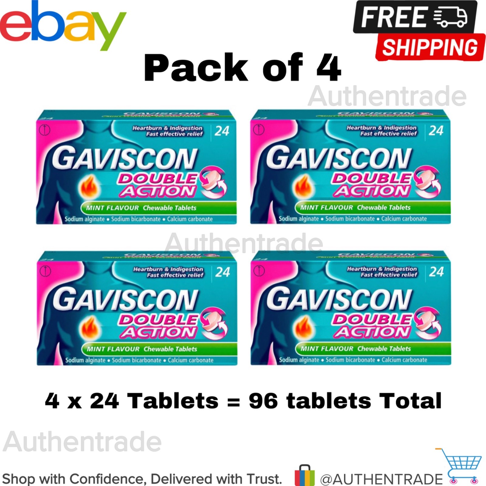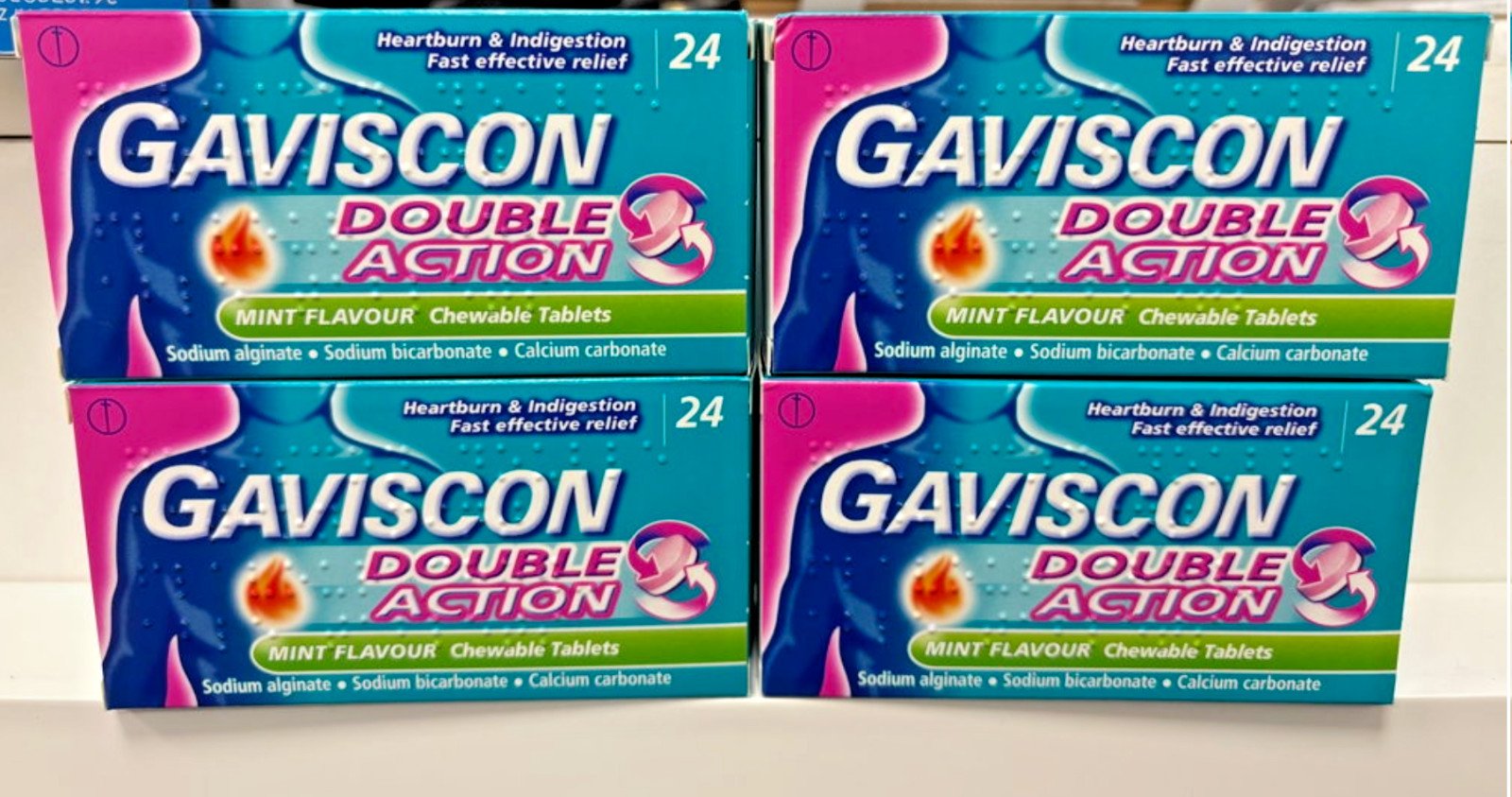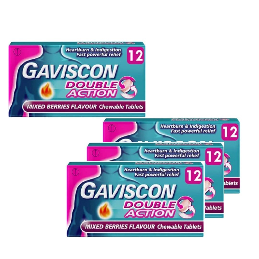 Gaviscon Double Action For Heartburn & Indigestion Relief, 4 Packs Of 24 Tablets, Total 96 - Fast-Acting, Soothing Mint Flavor, Effective Digestive Support