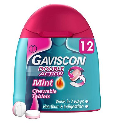Gaviscon Double Action, Chewable tablets, Mint, 24 tablets, Heartburn & Indigestion, Fast powerful relief, Gets to work in minutes, Dual relief on the go, Targets Heartburn and indigestion instantly