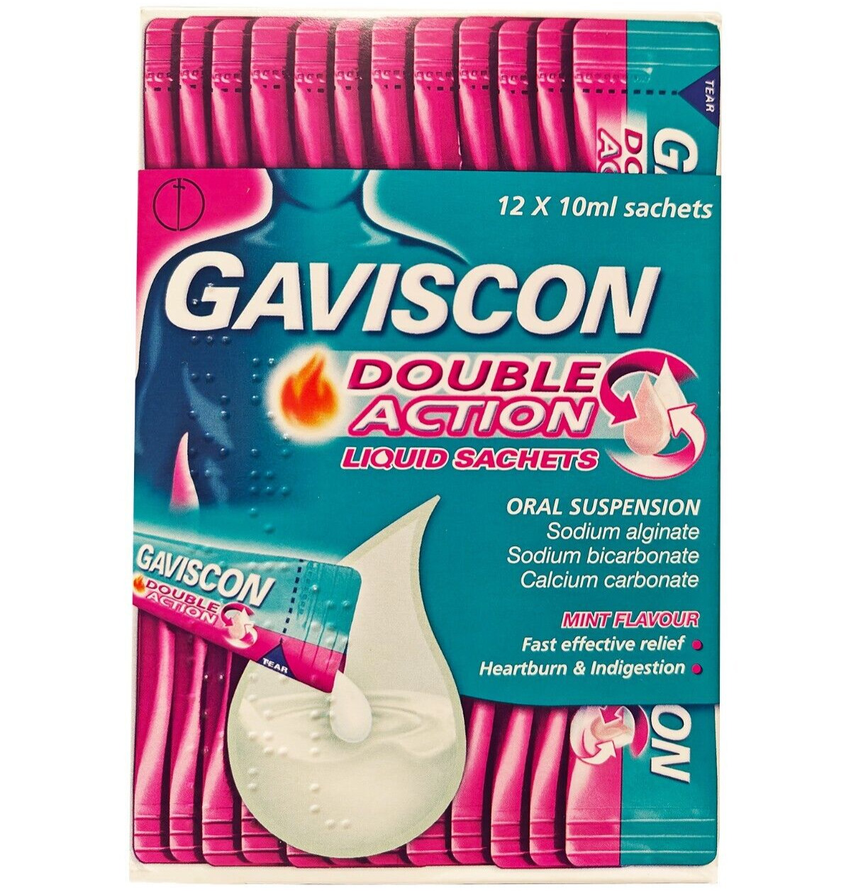 Gaviscon Double Action Sachets, Mint, 24 X 10ml, Heartburn Relief, Acid Reflux, Indigestion Liquid Gerd, Gastro Resistant, Gets To Work Instantly, Lasts 2X Longer, Antacids, Digestion and Nausea