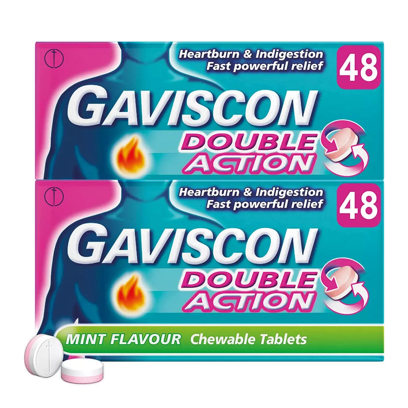 Gaviscon Double Action Tablets, Mint Flavour, 48 Tablets, Indigestion and Heartburn Relief, Indigestion Tablets, Acid Reflux, Antacid, Gets to Work Instantly, Lasts 2X Longer, Antacids