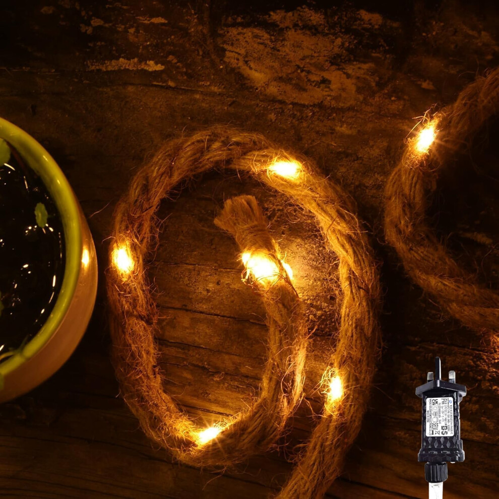 Gresonic Mains Powered Hemp Rope Fairy Lights, 80LED 6m String Light Warm White Waterproof Garden Outdoor Indoor Decor for Gazebo, Pergola, Christmas