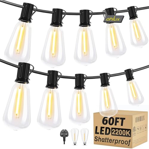 OHLUX 60FT/18m Outside Lights Mains Powered with 32 ST38 Vintage LED Edison Bulbs, E12 Festoon Garden Lights, 2200K, IP65 Waterproof, Shatterproof, Connectable for Deck, Balcony, Gazebo, Cafe