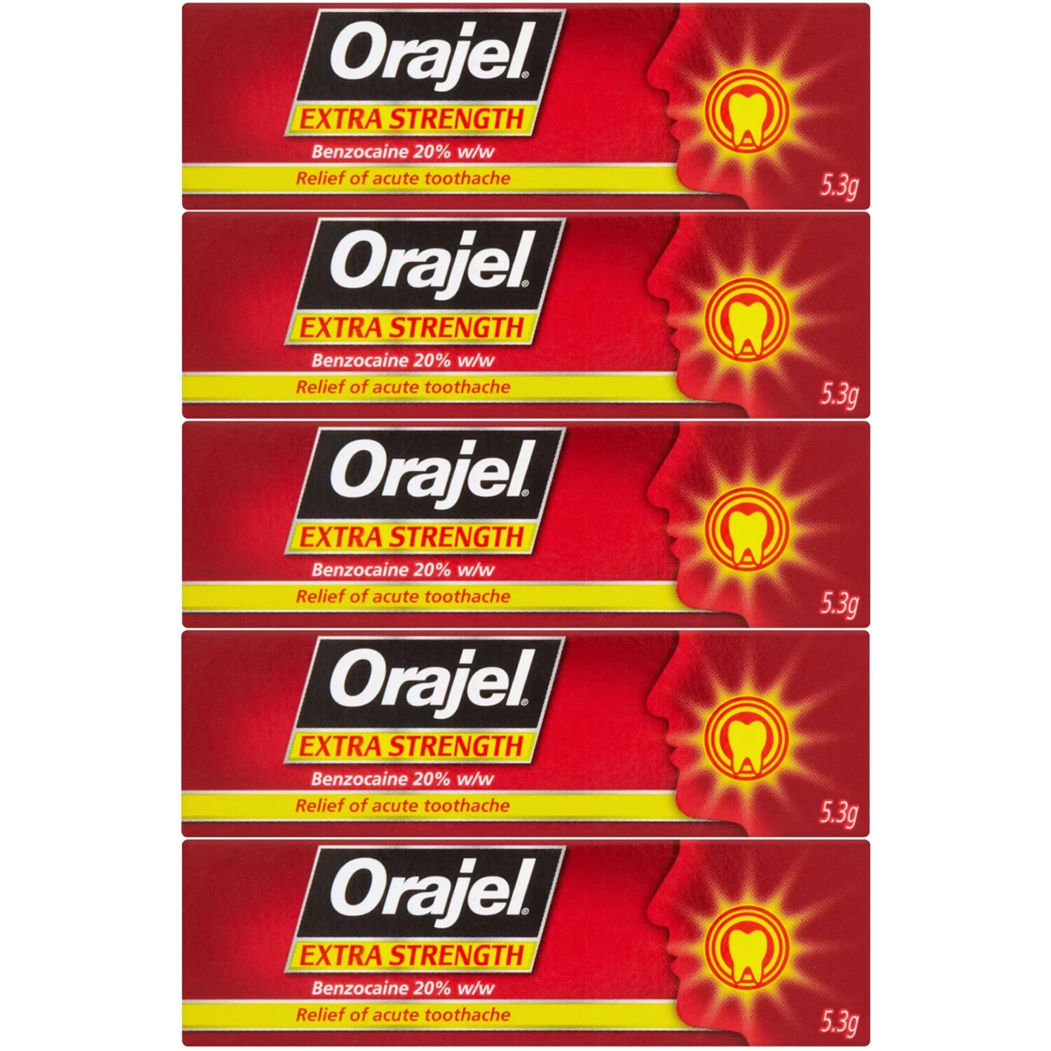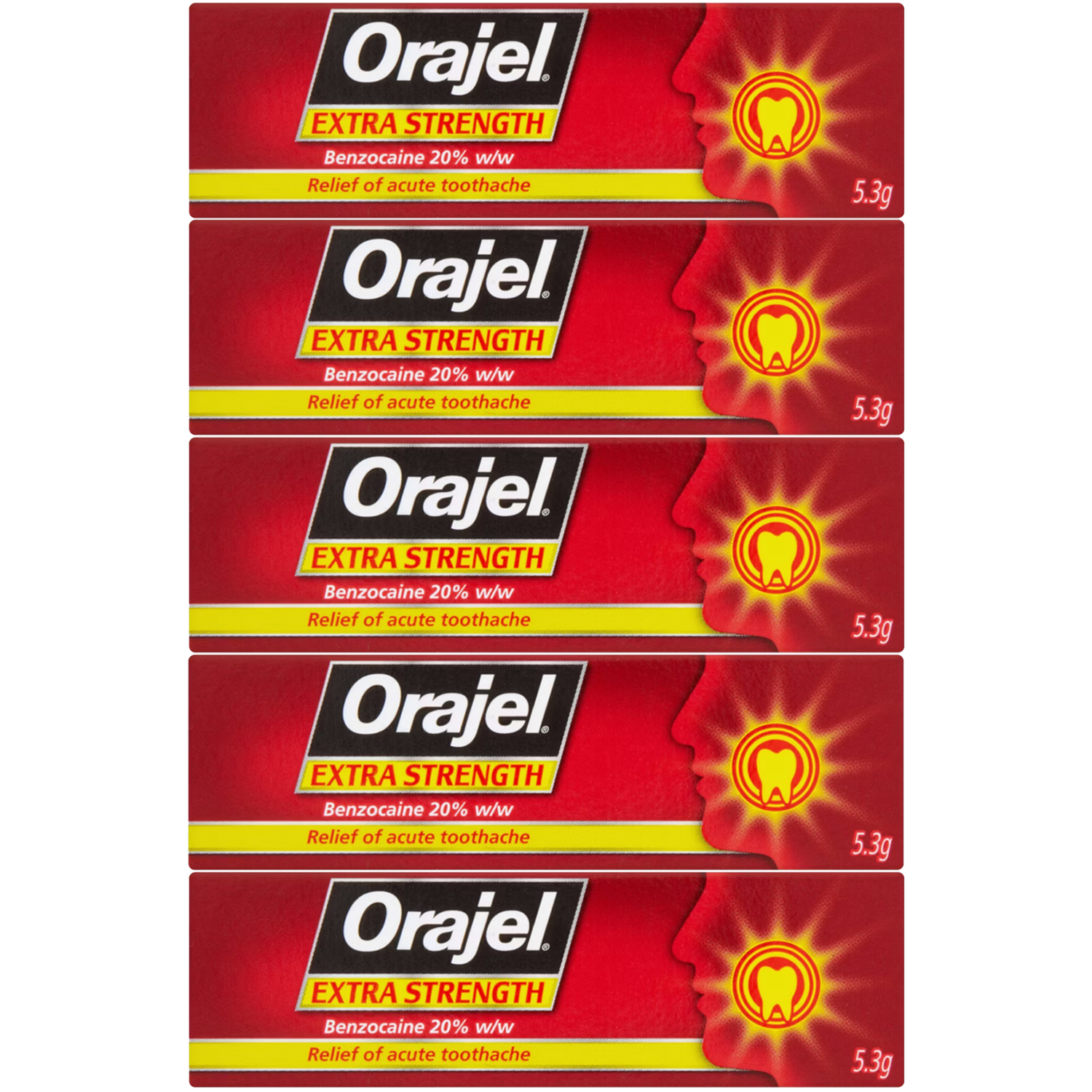 5 x Orajel Extra Strength acute toothache dental gel – 20% w/w Benzocaine 5.3g