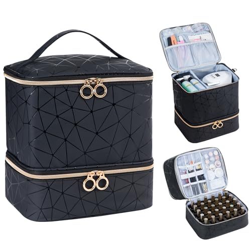Double Layer Carrying Case PU Storage Bag Portable Nail Polish Organizer Case for Makeup,Nail Lamp,Gel Nails,Nail Polish Kits for Manicure(Black)