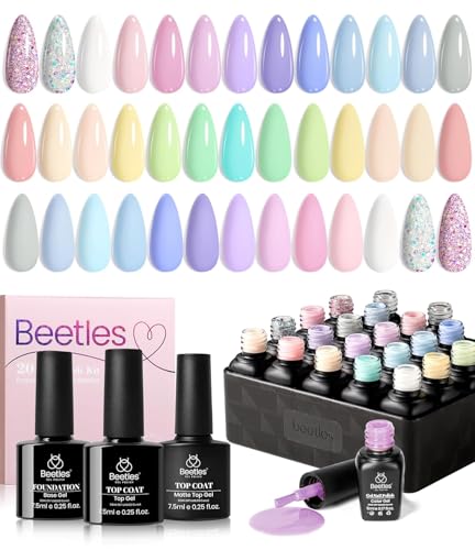 Beetles Gel Nail Polish - 20 Pcs Pastel Paradise Soak Off, Nude Gray Pink Blue Glitter Gel Polish Starter Kit with Glossy Matte Top Base Gel Coat Manicure Kit