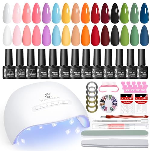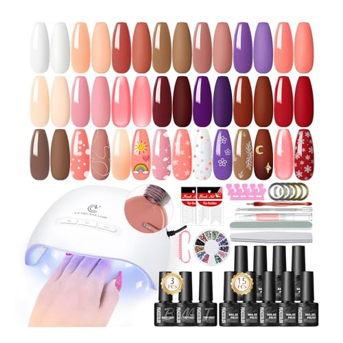 PEACECOLOR 34PCS Gel Nail Sets Starter Kit- Gel Nail Polish Set with Lamp Starter Kit 15 Colours Brown Red White Nude Nail Polish Nail Art Valentine's Day Gifts for Women DIY Home