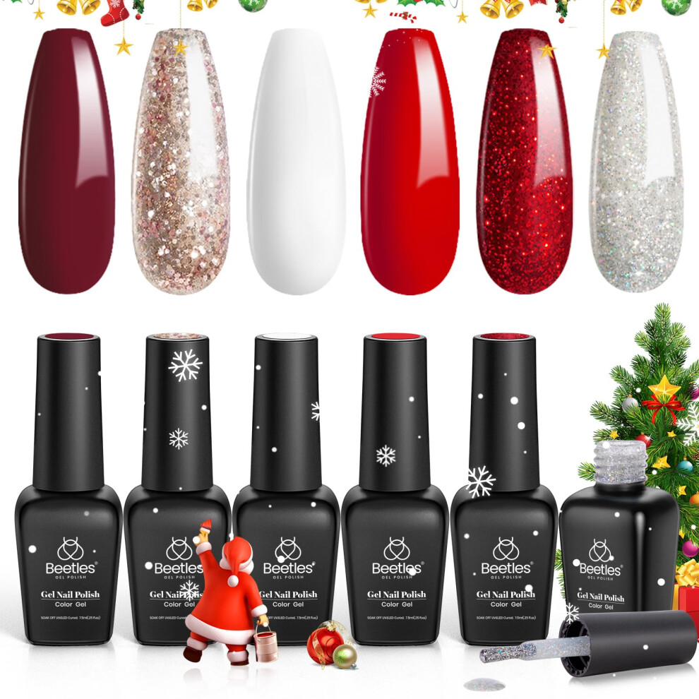 Beetles Red Gel Nail Polish, 6Pcs Candy Cane Christmas Gel Polish Glitter Burgundy Red Sparkle Gel Nail Kit Winter Snow White Silver Holiday Nail Gel,