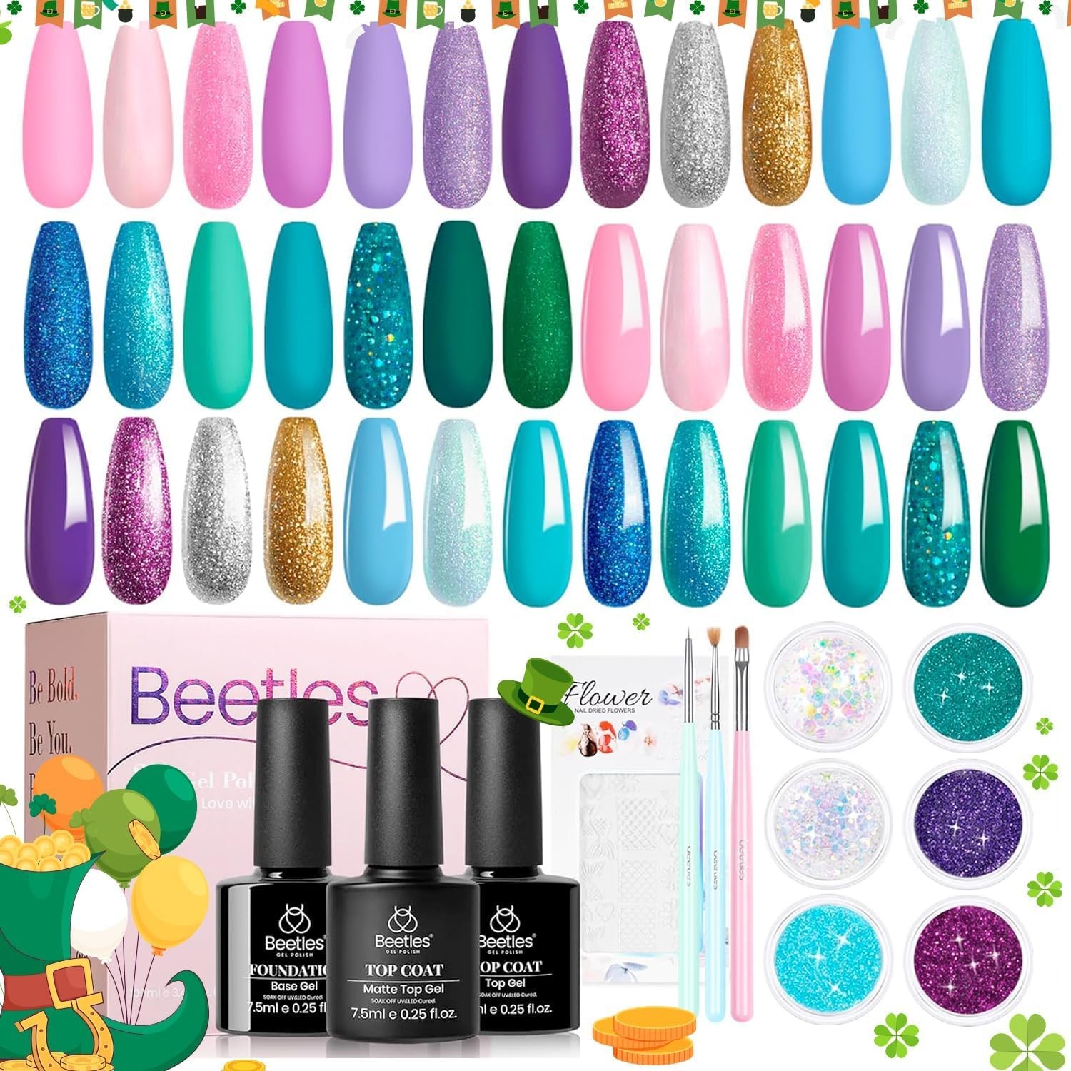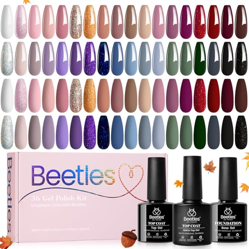 Beetles Gel Nail Polish Kit 36 Colors with Base Gel Glossy & Matte Top Coat Popular Colors Gel Polish Set Pink Red Green Black All Seasons Solid Sparkle Glitters Colors Gift for Women