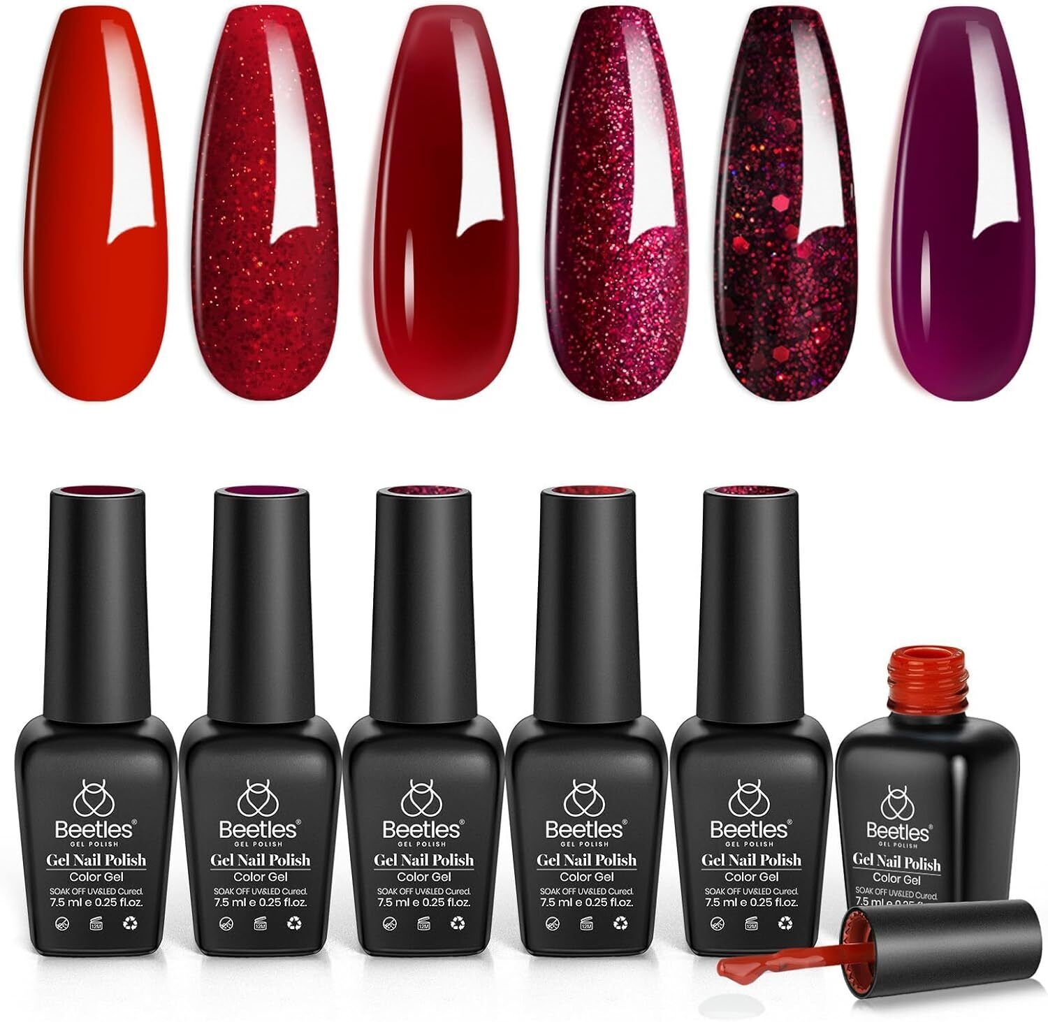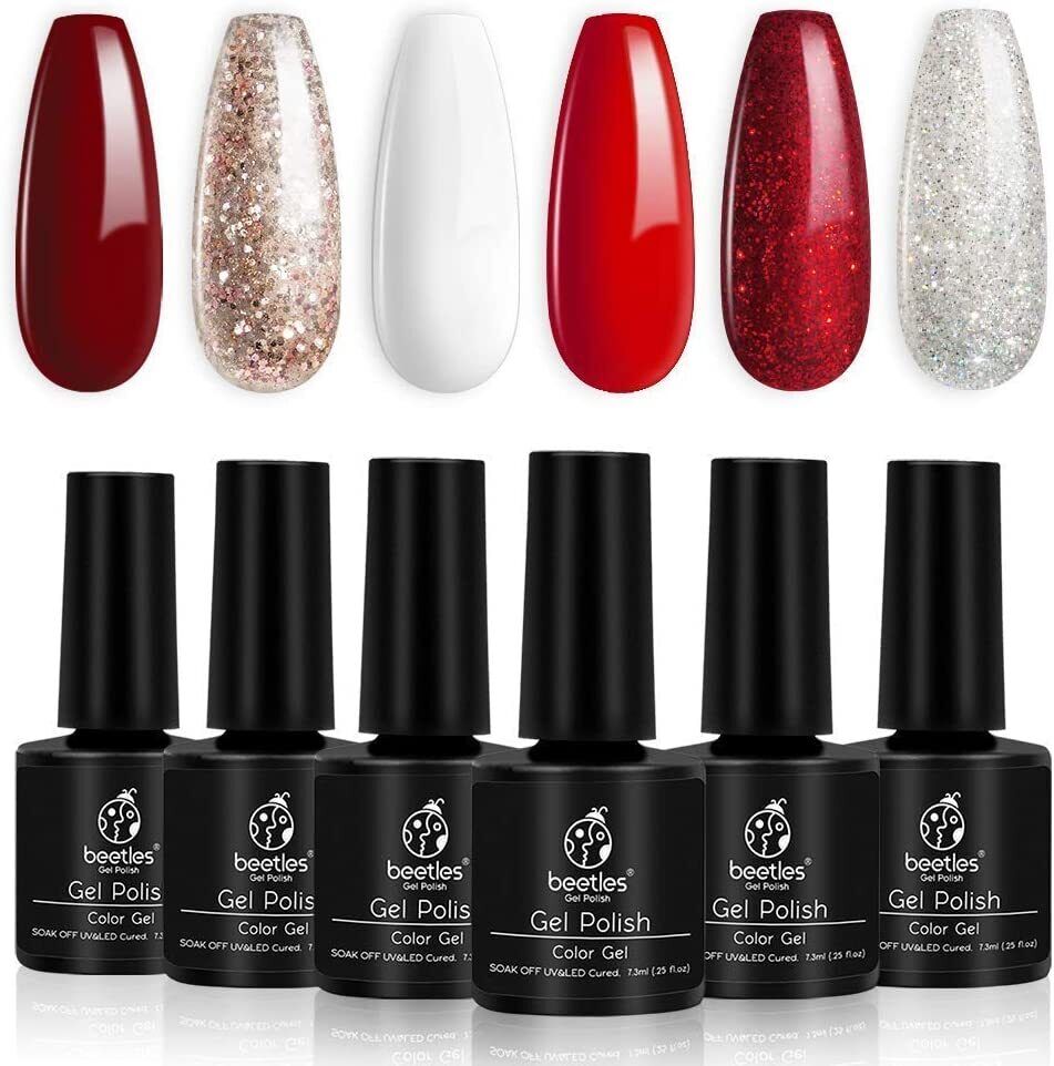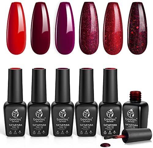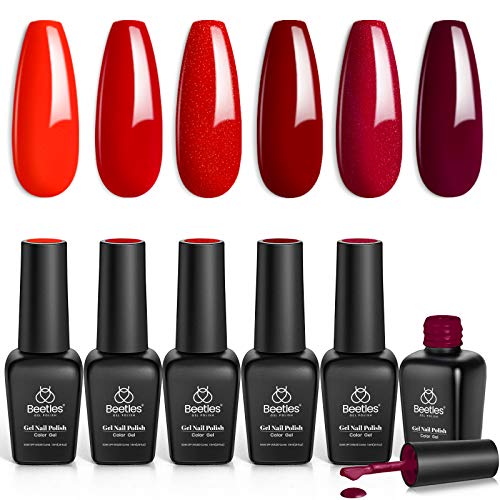 beetles Gel Polish- Bloody Mary Red Gel Nail Polish Set - 6 Pcs Shimmer Red Burgundy Glitter Nail Soak Off UV Kit Roses Manicure Design Gift for Women Girls