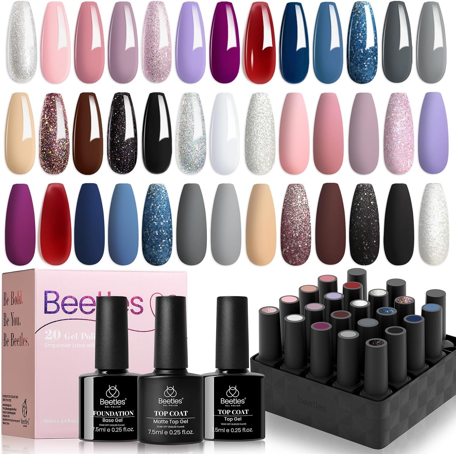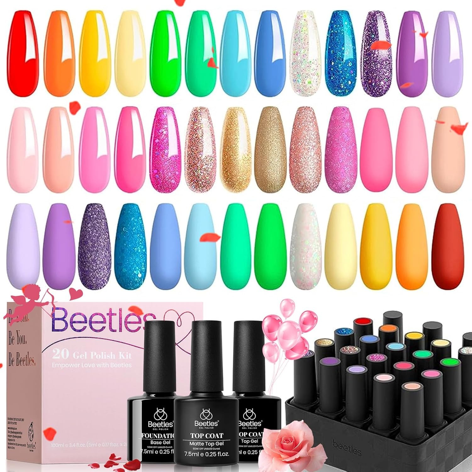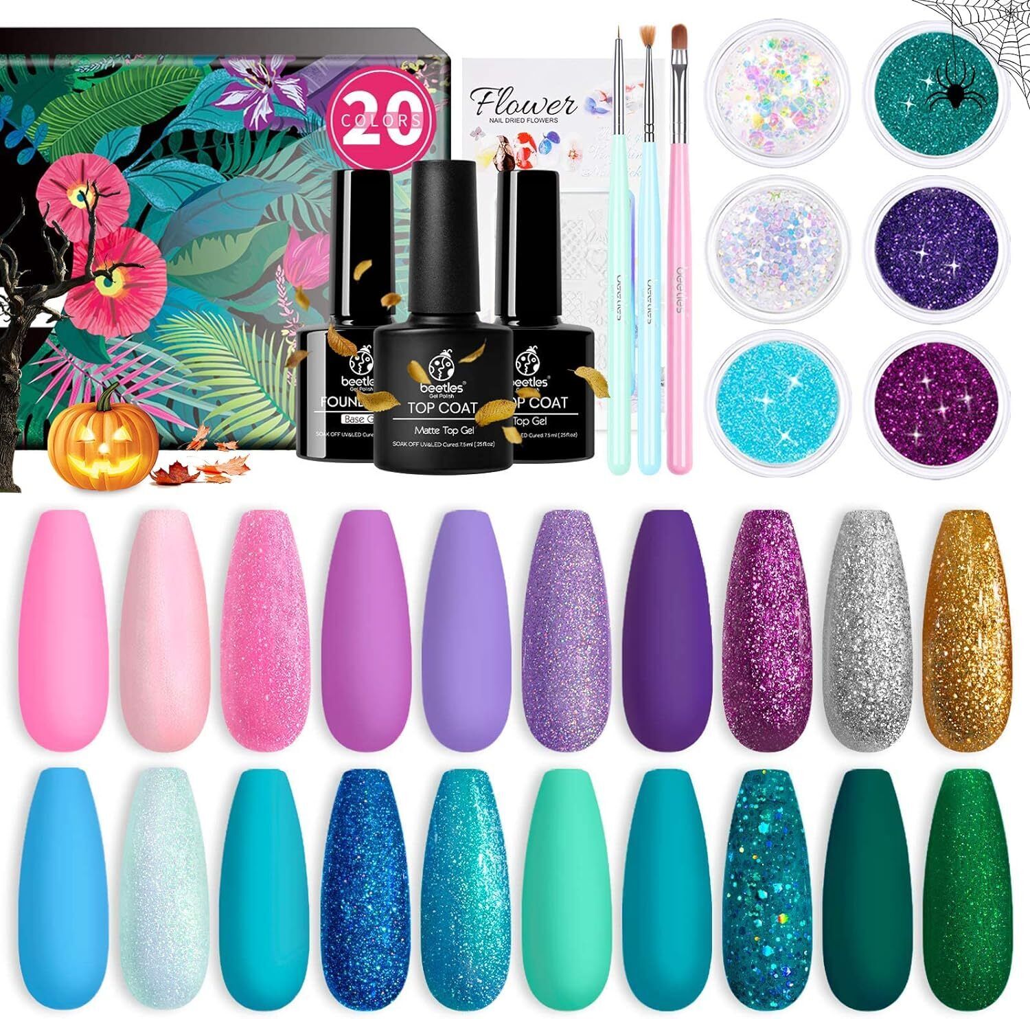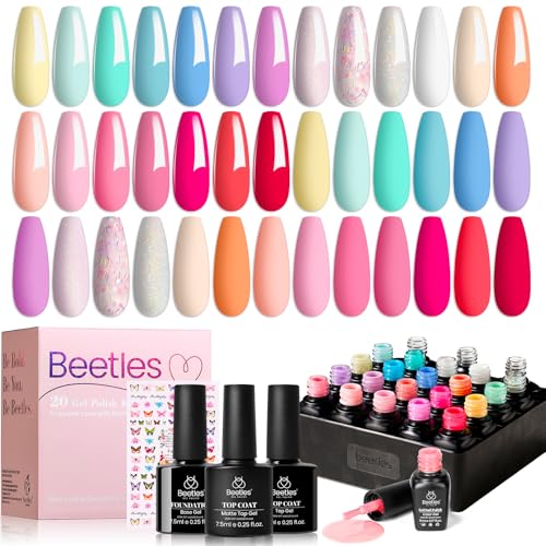 beetles Gel Polish Nail Set 23 Pcs 20 Colors Rainbow Collection Green Pink Blue Glitter Nude Manicure Kit for Girls with 3Pcs Base & Top Coat Uv Lamp Needed Gift Set
