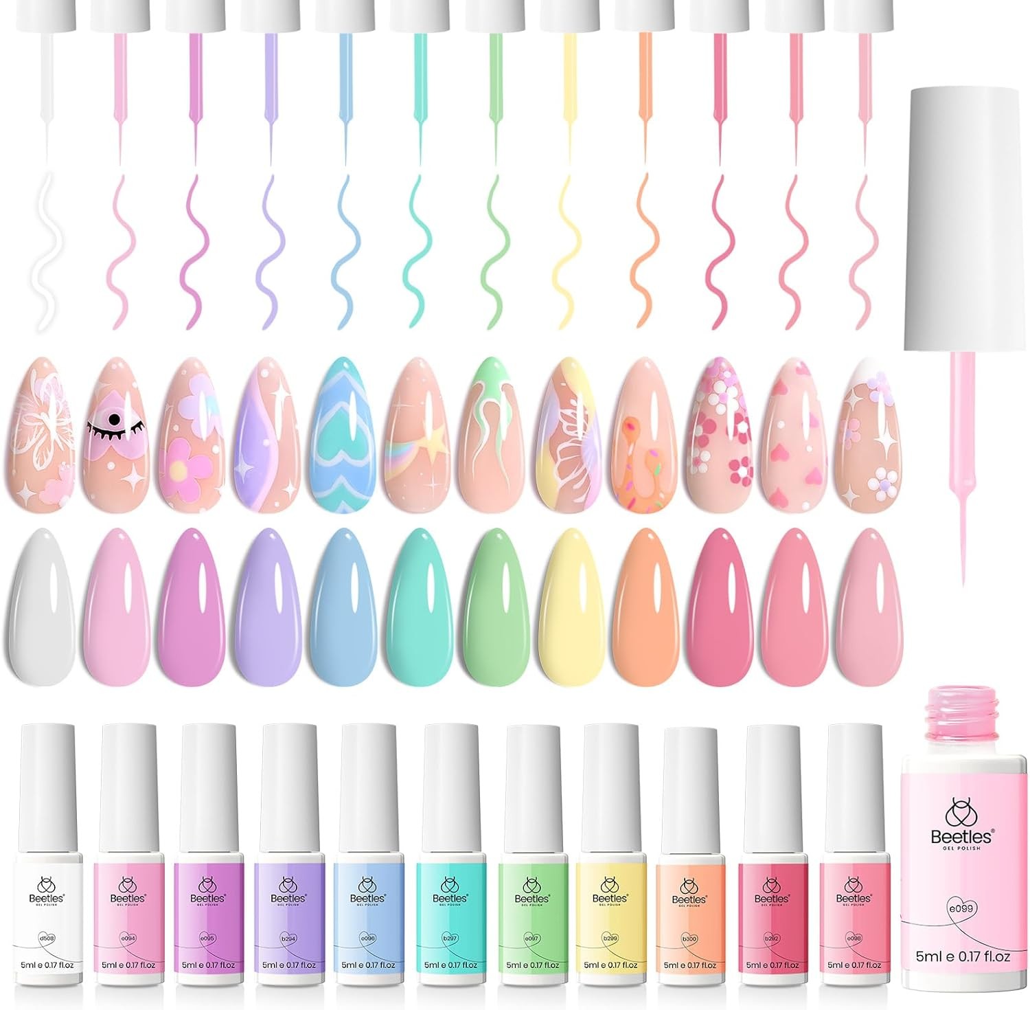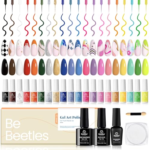 beetles Gel Polish Liner Gel Set-20 Colors Art Paint for Swirl Nails with Base Top Coat Thin Brush in Bottle Soak off White Black Red Silver Nude Glitters Gift for All Year Use