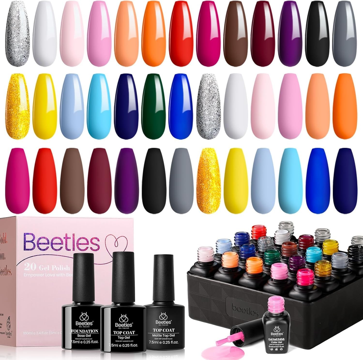 Beetles 23 Pcs Gel Nail Polish Set- Red Orange Yellow Blue Dark Green Gel Nail Kit Soak Off UV LED Nail Lamp Black White Sliver Gold Glitter Gel Polish Top Coat Base Gel Nail Art Salon Manicure Kit