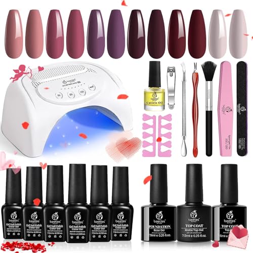 Beetles Gel Polish Starter Kit 6 Pcs Rose Petals Winter Gel Polish Set with 48W UV LED Nail Lamp Gel Nail Kit Base Gel Top Coat Peach Pink Purple Burgundy Red Gel Nail