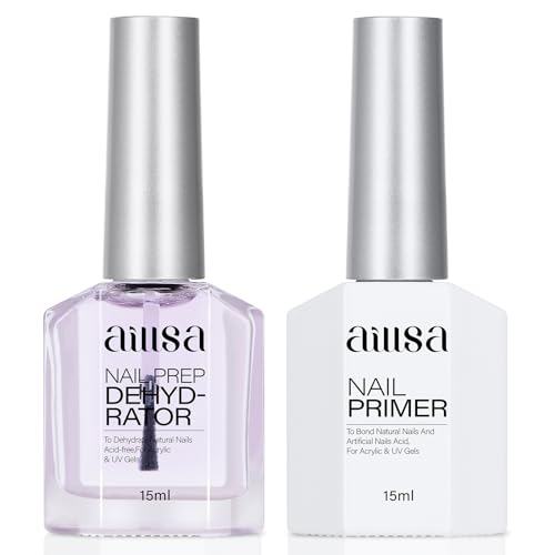 AILLSA Nail Primer & Dehydrator Set - Professional Bonding Gel Polish, No Acid Fast Air Dry Nails Prep Set, Poly Nail Builder, Acrylic Powder, 2 x 15 ML