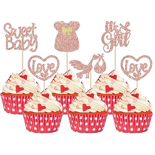 Gyufise 30Pcs Baby Shower Sweet Baby Cupcake Toppers It's a Girl Cupcake Picks Glitter Bow Dress Love Heart Cake Picks Decorations for Gender Reveal Baby Shower Girls Birthday Party Supplies Rose Gold