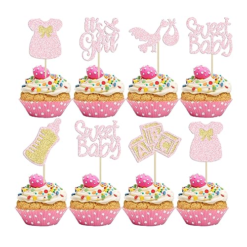 Gyufise 30Pcs Baby Shower Sweet Baby Cupcake Toppers It's a Girl Cupcake Picks Glitter Bow Dress Love Heart Cake Picks Decorations for Gender Reveal Baby Shower Girls Birthday Party Supplies Pink