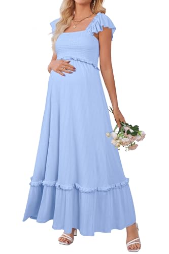 OUGES Womens 2025 Summer Maternity Baby Shower Dress Casual Boho Maxi Smocked Maternity Photoshoot Dresses Ruffle Sleeve Square Neck Gender Reveal Dress Pregnancy Must Have Clothes (Sky Blue,L)