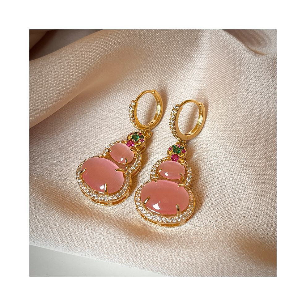 New Chinese Bamboo Leaf Pearl Tassel Earrings Retro Light Luxury High-End Pink Cat's Eye Stone Gourd-Ear Clasp