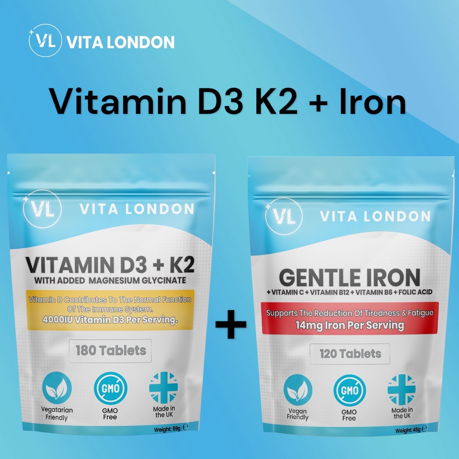 Vitamin D3 K2 Magnesium + Gentle Iron & Vitamin C B12 B6 Tablets - 2pk Set