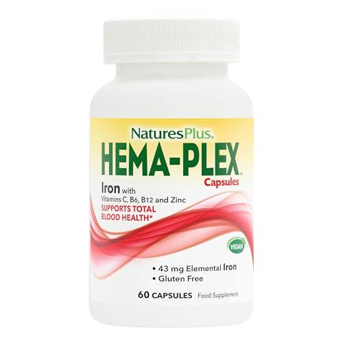 NaturesPlus Hema Plex Capsules - Gentle, Fast Acting Iron Capsules with Vitamin C, Methyl B12, Folate - Blood Health and Energy Support - Vegan, Gluten Free - 60 Capsules
