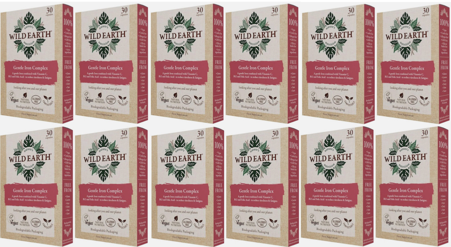 12 PACKS (360 CAPSULES) WILD EARTH GENTLE IRON COMPLEX FOOD SUPPLEMENT EXP 02/25
