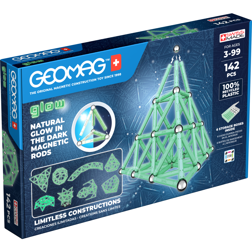 GEOMAG, Recycled Glow, Magnetic Constructions With Glow Effect, Magnetic Bars Glowing in the Dark, 142-Piece Pack, 100% Recycled Plastic