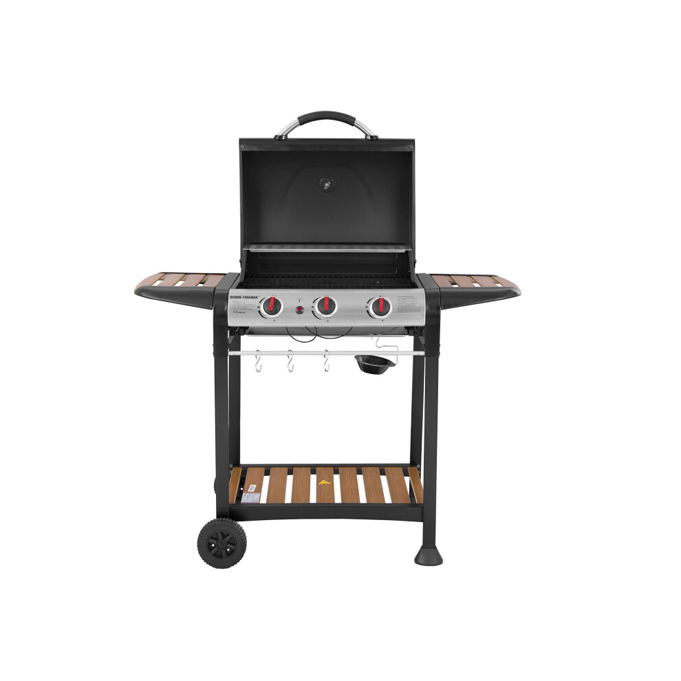 George Foreman 3 Burner Gas BBQ with Automatic Ignition & Integrated Thermometer, Black, Gas Barbecue, 2 Wheels Fitted Rack with 2 Shelves Wood