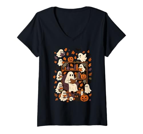 Womens Spooky Ghost Reading Books Chair Halloween Library Bookworm V-Neck T-Shirt