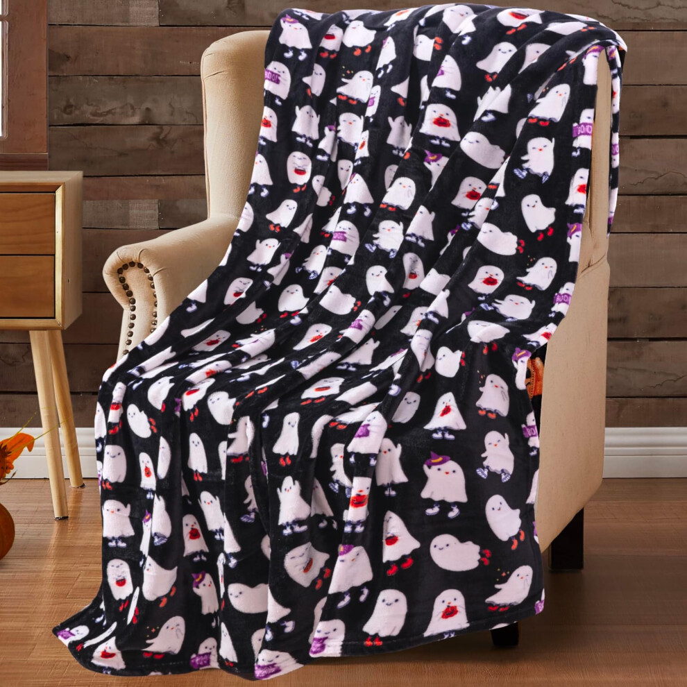 Halloween Ghost Throw Blanket for Bed Couch Chair Living Room Soft Warm Fleece Plush Blanket (Black White Ghost Bash) Oversized 50"""" x 70""""