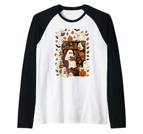 Spooky Ghost Reading Books Chair Halloween Library Bookworm Raglan Baseball Tee