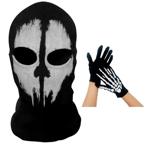 GWAWG COD Ghost Mask Skull Balaclava MW2 Skeleton Costume Full Head Ski Snood Mask Knitted Windproof Warmer Headwear with Skeleton Gloves for Bike Skateboard Motorcycle Snowboard Outdoor Sport Black