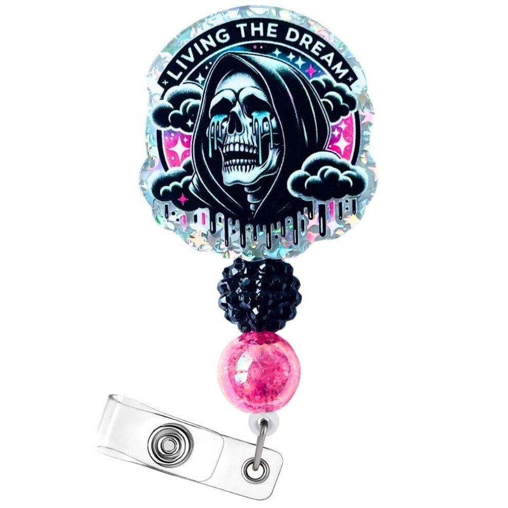 Living The Dream Funny Halloween Badge Reel Retractable ID Name Holder Clip Fun Spooky Ghost Skull Grim Reaper Radiology Skeleton Sarcastic ER Tech RN