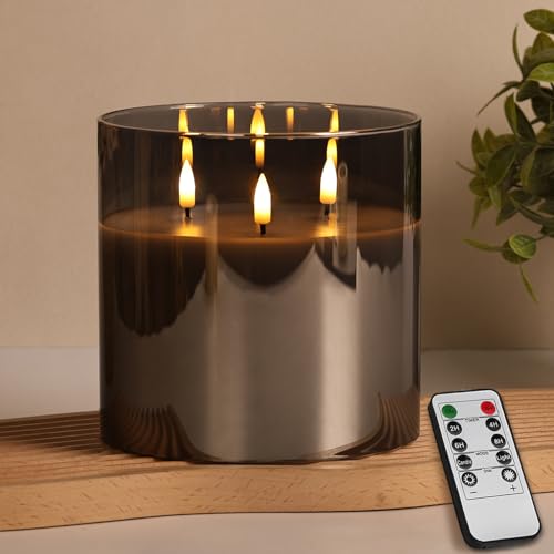 Eywamage Giant 3 Wick Grey Glass Flameless Candle with Remote, Flickering Real Wax Battery LED Pillar Candle Φ 6" H 6"