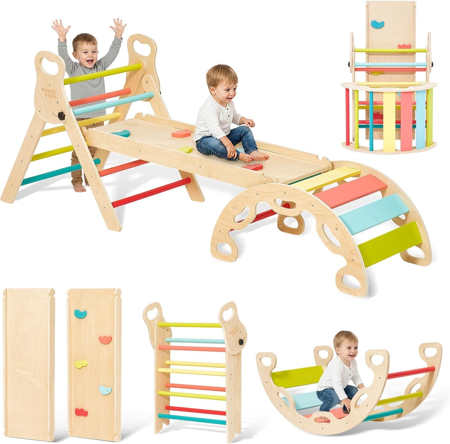 Giant bean Pikler Triangle 5 in 1 Pastel Set with Slide and Climbing Arch Ramp Wooden Foldable Climbing Toys for Toddlers Montessori Climbing Kit for 1-3 Years Old Kids