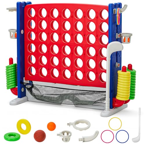 Giant 4-to-Score Game Set, 4-in-A-Row Jumbo w/Basketball Hoop, Ring Toss, 42 Jumbo Rings & Quick-Release Slide, 2.75FT Tall Indoor Outdoor Yard Family Game