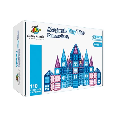 SUNNY AUNTIE Magnetic Tiles 110 PCS, Princess Castle Magnet Blocks, Toys for Girls, 3 4 5 6 7 8 Year Old Girl Birthday Gift Ideas, Magnetic Building Blocks + Zippered Carrying Case + 2 Dolls Gift