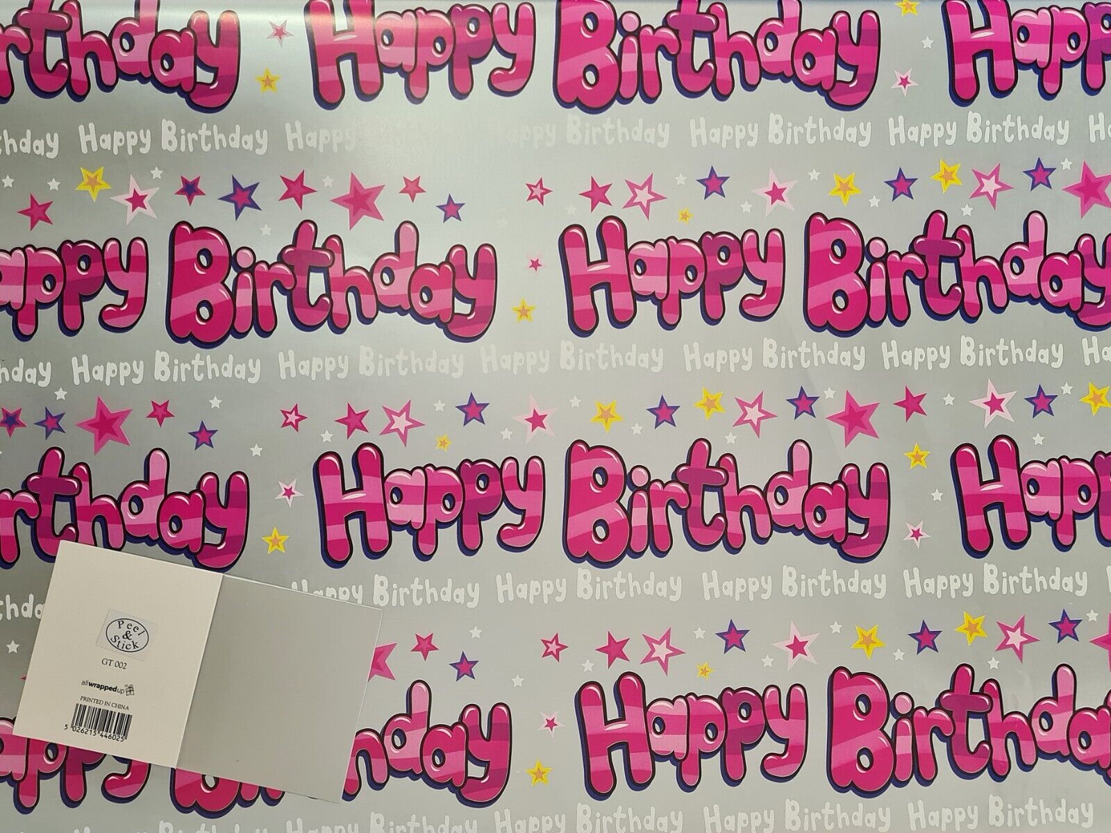 2 Sheets Gift Wrap Wrapping Paper Happy Birthday Silver with Pink Bubble Writing