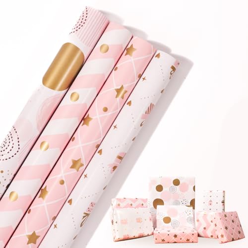 HBell Pink Wrapping Paper Rolls, 4 Rolls Birthday Gift Wrap Paper, Girls Gift Wrap 43cm x 3M for Mother's Day, Easter, Baby Shower, Party, Festive Decorations