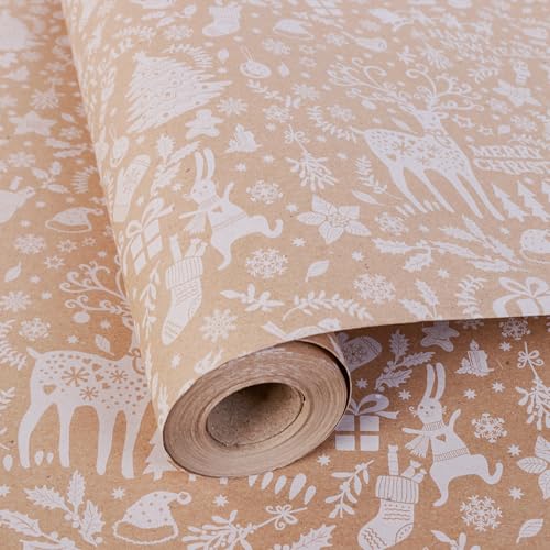 HBell Christmas Wrapping Paper Roll,43cm x 15m Kraft Christmas Wrapping Paper,Brown Gift Wrap paper for Xmas Gift Wrap,New Year,Birthday,Holiday(white elk)