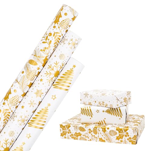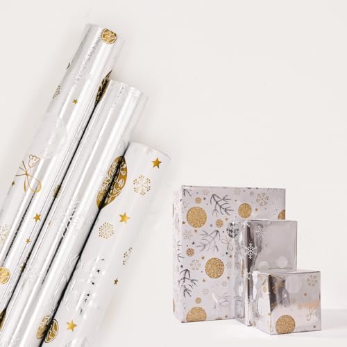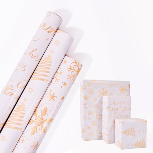 Christmas Wrapping Paper Roll,3 Rolls 43cm x 3m Xmas Gift Wrapping Paper,Metallic Gift Wrap Paper with Snowflake Xmas Tree Pattens for Christmas,Party,Festive Decorations (white gold)