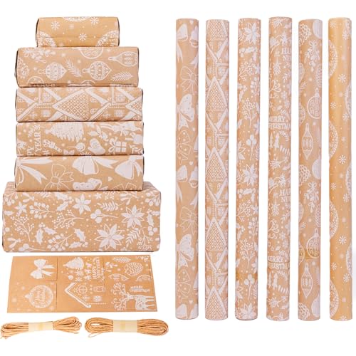 HBell Christmas Wrapping Paper Rolls,6 Rolls 44cm x 3M Brown Christmas Wrapping Paper,Kraft Gift Wrap Paper, Suitable for Xmas Gift,Birthday,New Year,Party,Festive Decorations (white)