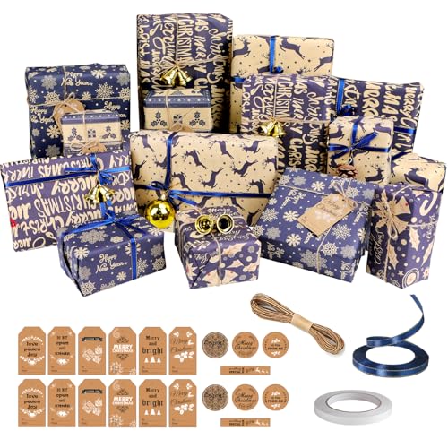 15 Sheets Christmas Gifts Wrapping Papers Set With Tags Twine Ribbon Tape, Blue Recyclable Xmas Gift Wrap Paper for Kids Children Adults Christmas Arts Crafts Present Decorations, 50 x 70cm